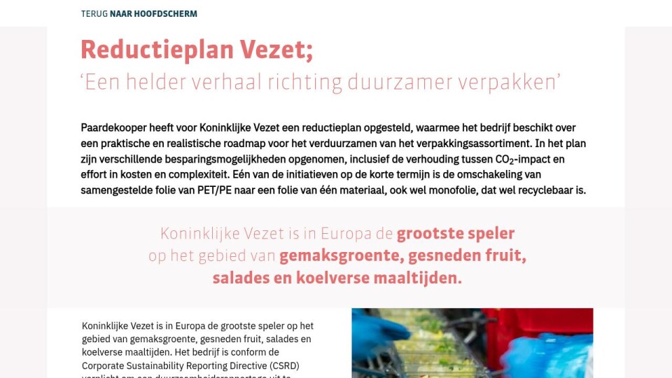 Koninklijke Vezet is in Europa de grootste speler op het gebied van gemaksgroente, gesneden fruit, salades en koelverse maaltijden. Het bedrijf is conform de Corporate Sustainability Reporting Directive (CSRD) verplicht om een duurzaamheidsrapportage uit te brengen. Als leverancier helpen we Vezet bij het inzichtelijk krijgen van de impact van onze producten binnen scope 3 (de impact in de waardeketen) en zoeken we samen naar mogelijkheden om deze